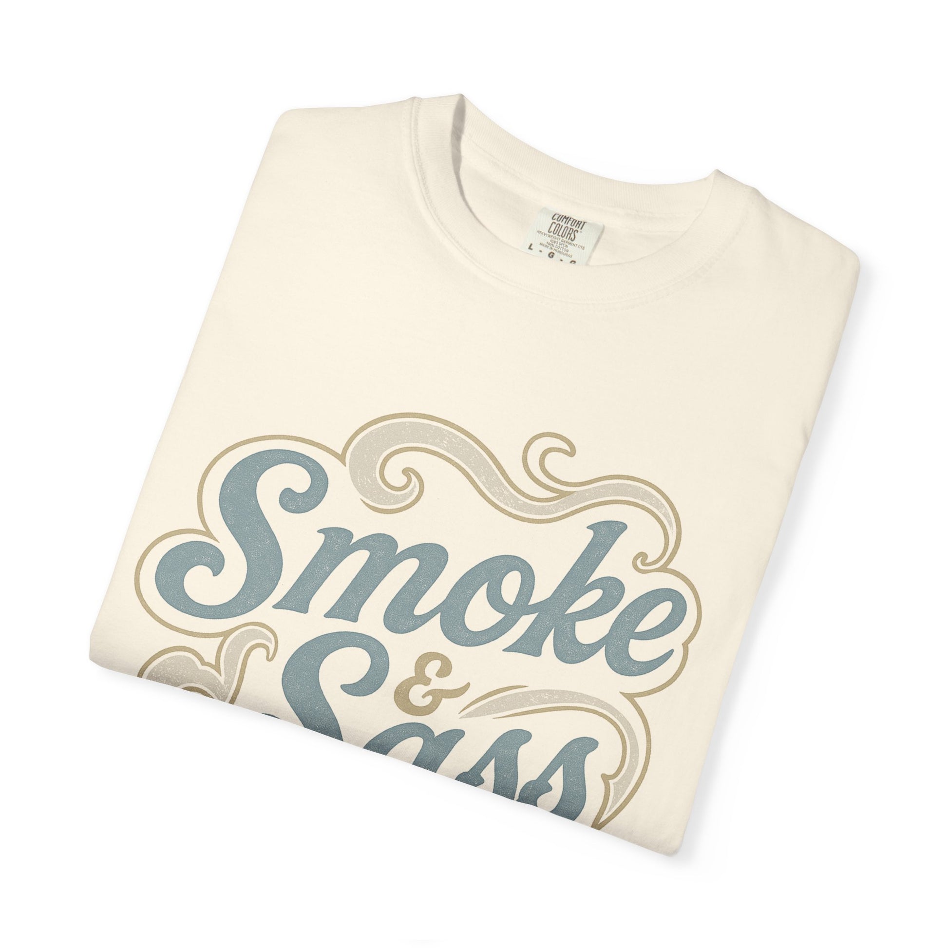 This vintage-inspired graphic blends dusty blue and taupe tones in a swirling smoke design that captures the spirit of BBQ, backroads, and bold confidence.